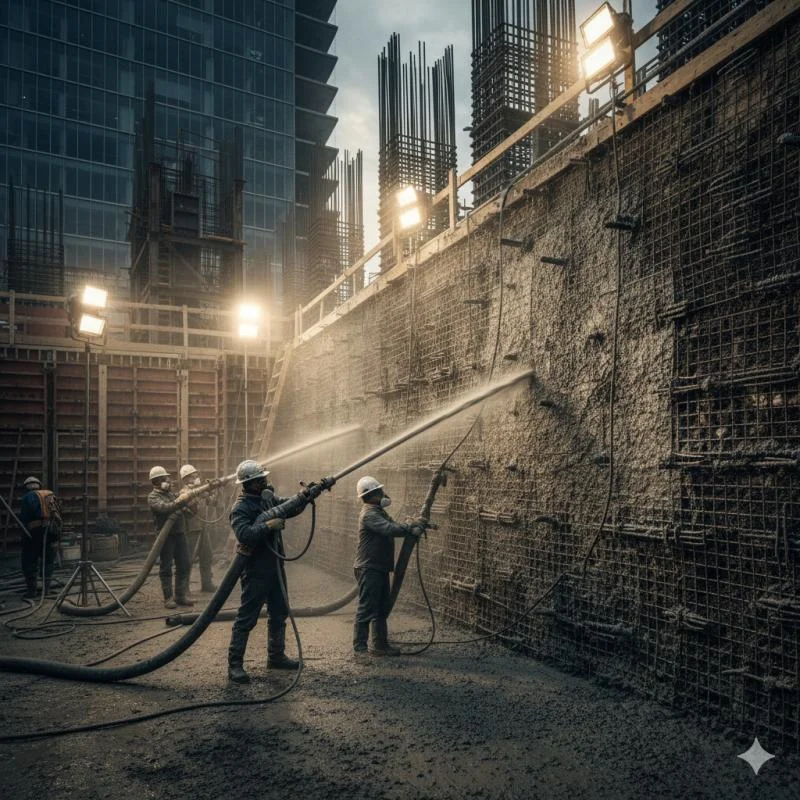 Essa técnica consiste na projeção de concreto ou argamassa com alta velocidade sobre superfícies, proporcionando aderência e resistência.